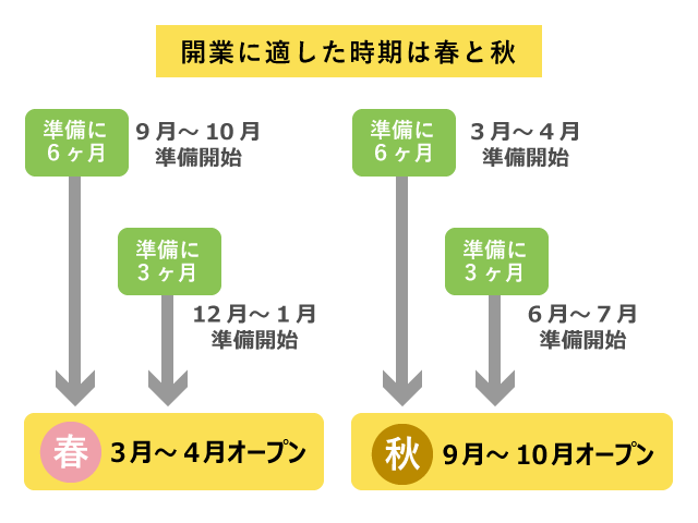 一般的に、開業(オープン)に適した時期は、春か秋に目標設定すると良いでしょう。